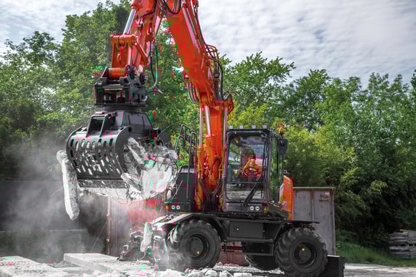 cumulant davantage de chantiers grâce à l'excellente polyvalence de cette pelle sur pneus conforme aux normes européennes de niveau V.